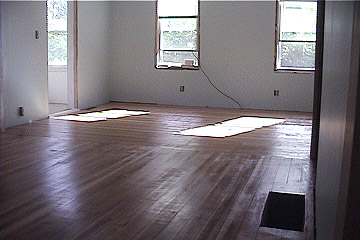 E spent the better part of this week wrestling a drum sander and edger to take off the old finish and stain. Afterwards, the grain was raised and we went over it with hand sanders in preparation for final finish.