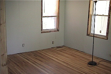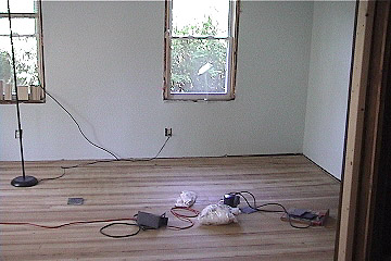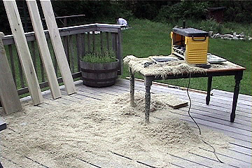 Between coats (it takes about two hours to dry), I planed down some rough lumber for making new casings for the doorways. The big board at the left weighed about 35 pounds. I had to be careful that it didn't tip over the planer. E is in the background stripping paint from doors.