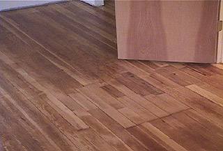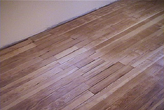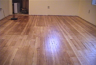 After sanding with the heavy tools, we gave the floor a light coat of water which raises up the grain and takes away a lot of the dust. Then we went over it with palm sanders and 120 grit to get the surface much smoother.